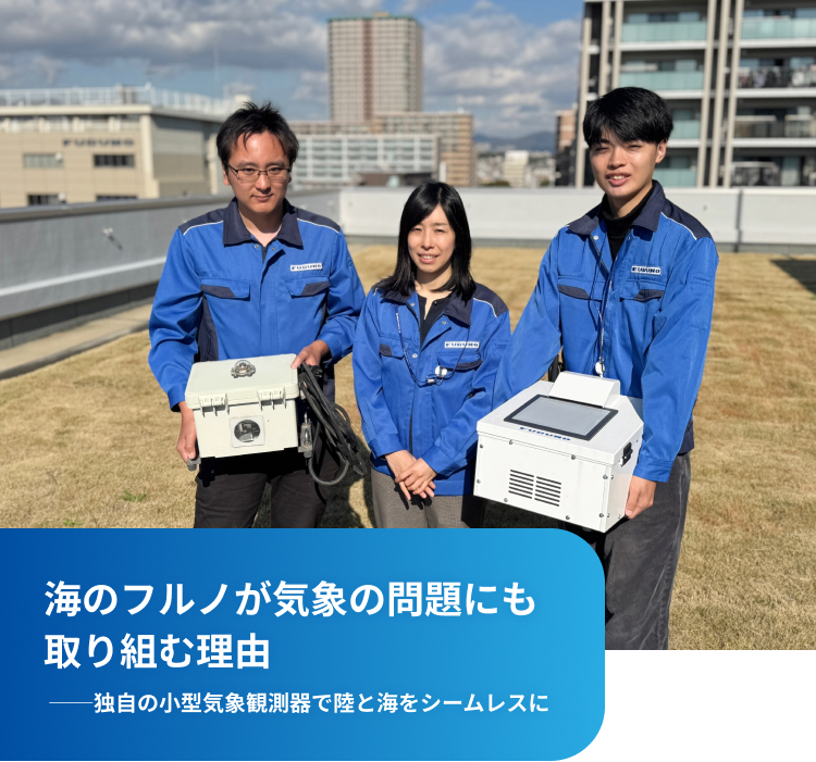 フルノは水陸両方の気象を対象とした研究・観測機器の開発にも取り組んでいます。 その背景や技術的強みを、気象チームの社員3名の声を通して紹介します。